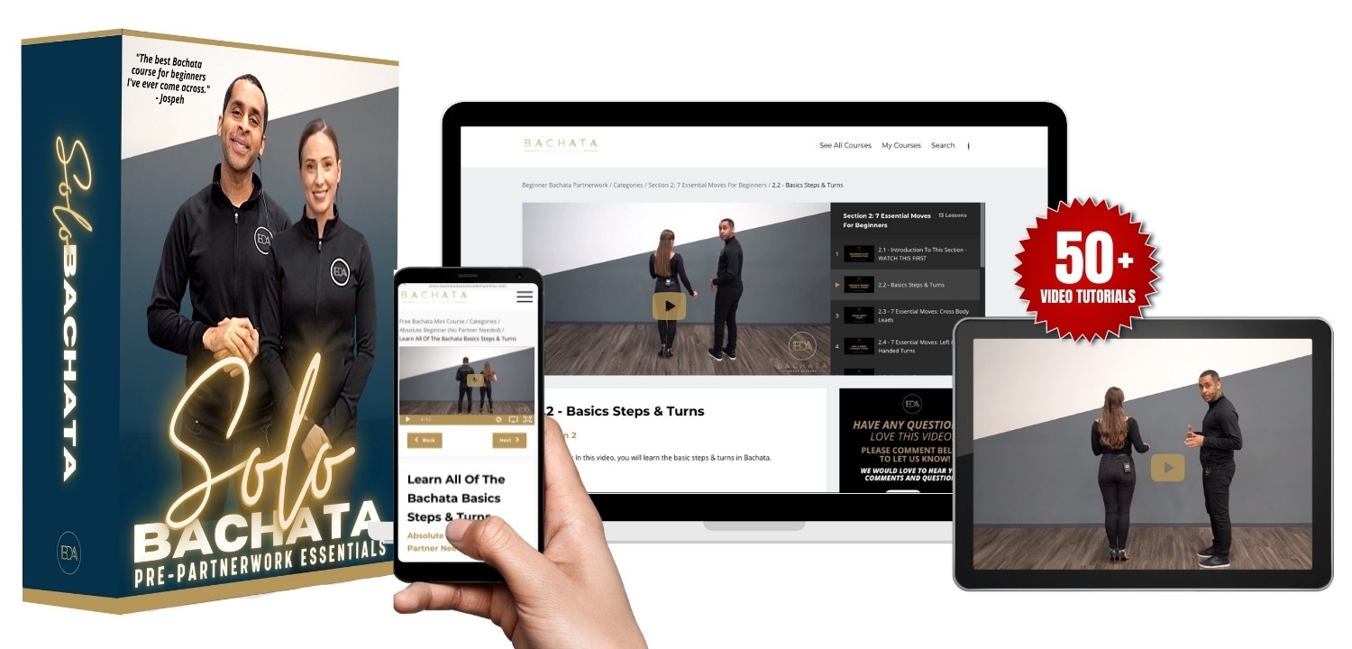 → Instantly get access to over 50 step-by-step Beginner Bachata tutorials so you can quickly learn how to improve your dancing and confidence without ever needing a partner to practice with.